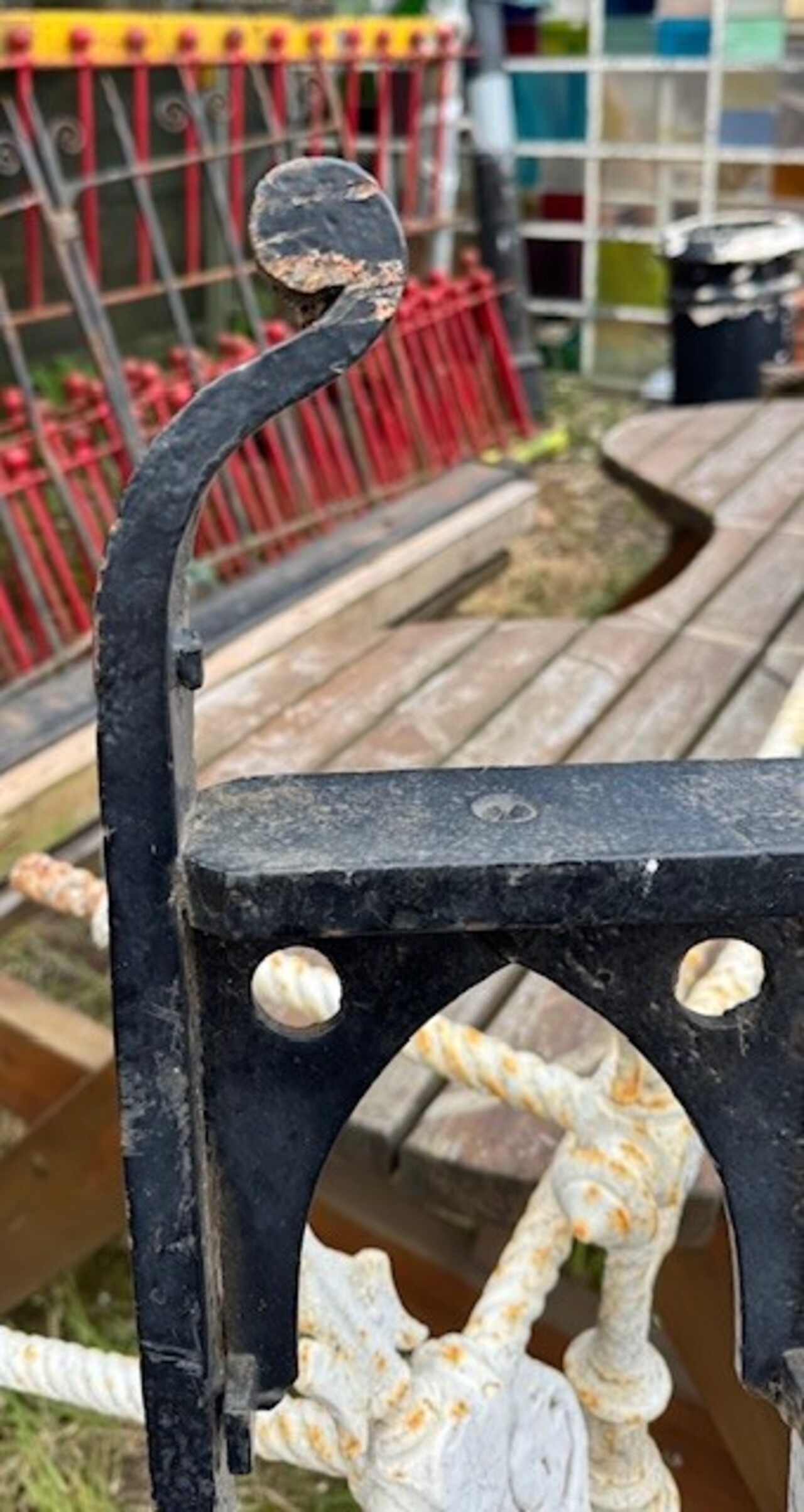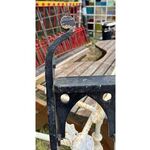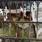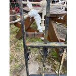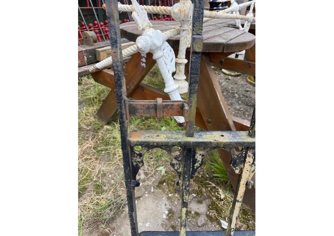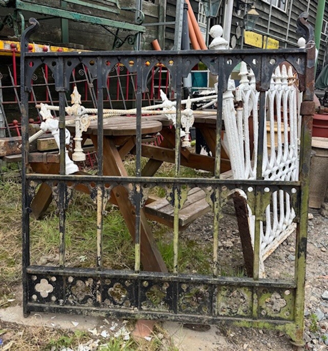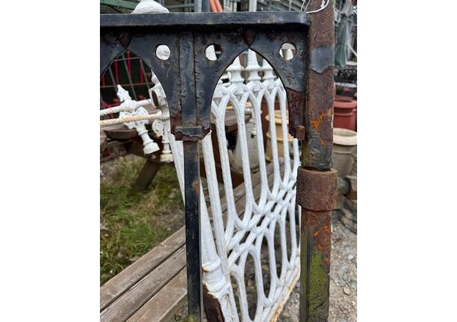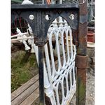 A striking antique cast iron gate featuring a distinctive Gothic lattice pattern, likely dating to the late 19th century. The design combines slender vertical bars with a decorative framework of pointed arches and quatrefoil cut-outs, giving the piece a light, architectural feel while retaining strength and durability.