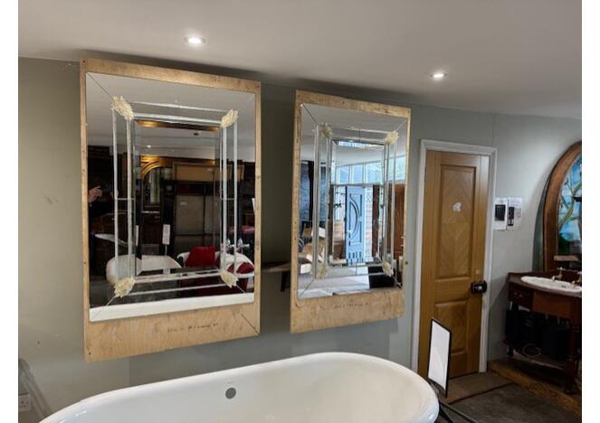 These glass hand made vanity units are ressesed with LED lighting once the doors are opened .