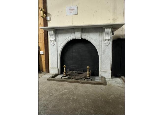 This stunning reclaimed marbel arch fire surround has inlayed detailing and carved corbels . It is complemented by the polished cast iron Cameo fire insert with wonderful castings .
