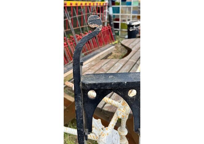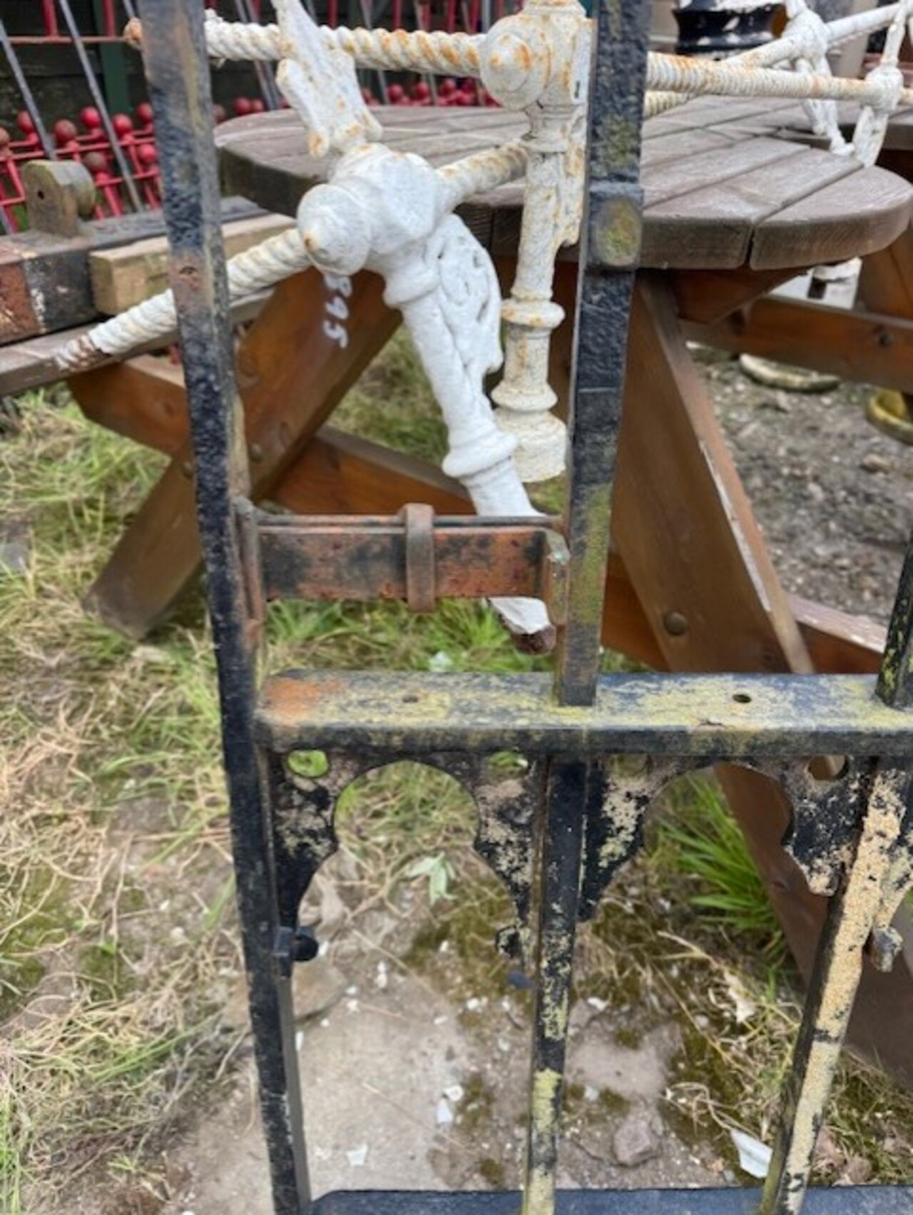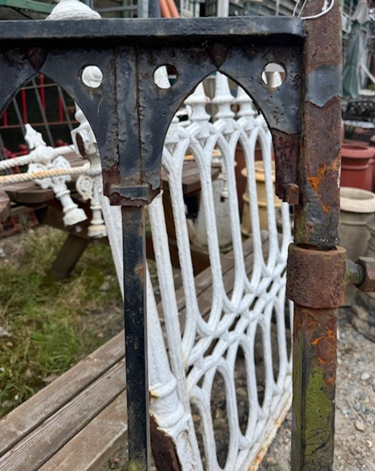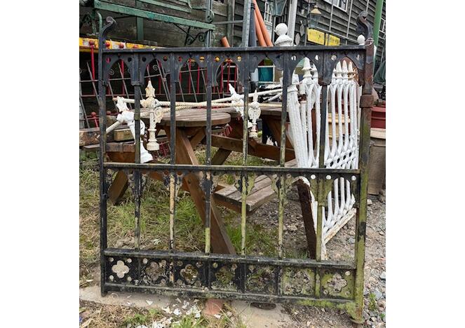 A striking antique cast iron gate featuring a distinctive Gothic lattice pattern, likely dating to the late 19th century. The design combines slender vertical bars with a decorative framework of pointed arches and quatrefoil cut-outs, giving the piece a light, architectural feel while retaining strength and durability.