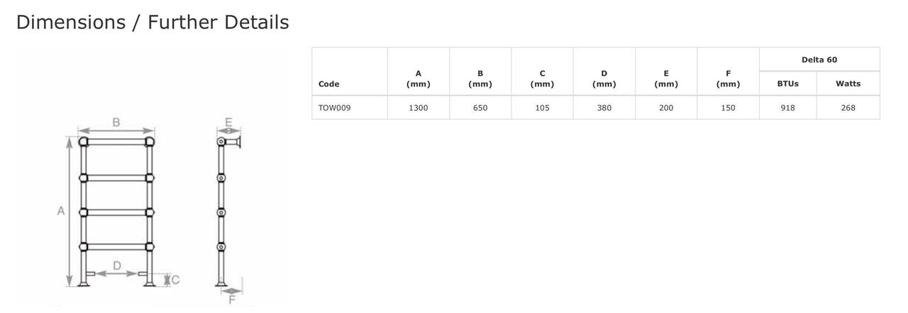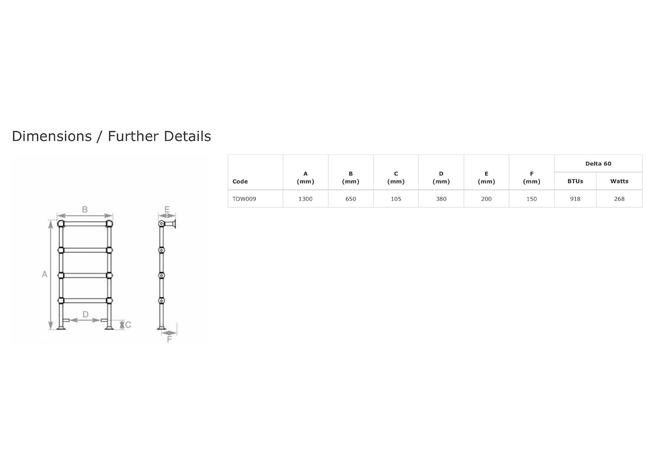 - The output of this towel rail is 918 Btu's 268 watts (The output figures quoted are to Delta 60)
