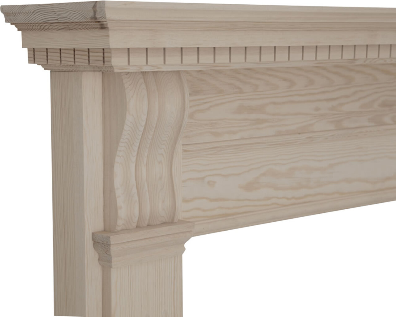 Corbels separate columns with three vertical curved indentations from a repeated-square pattern that stretches beneath the broad mantel.