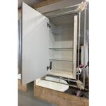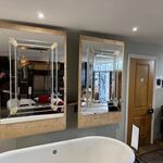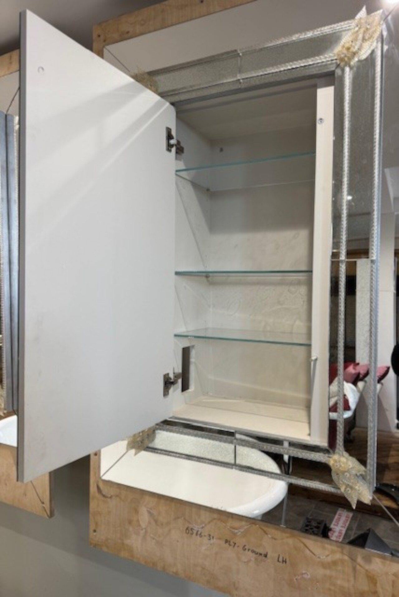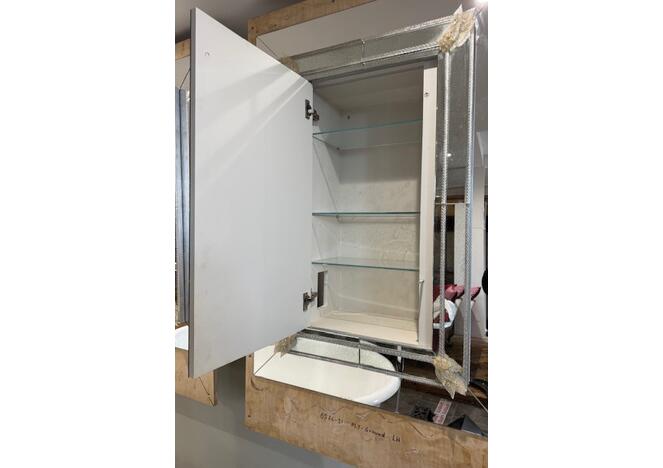 These glass hand made vanity units are ressesed with LED lighting once the doors are opened .