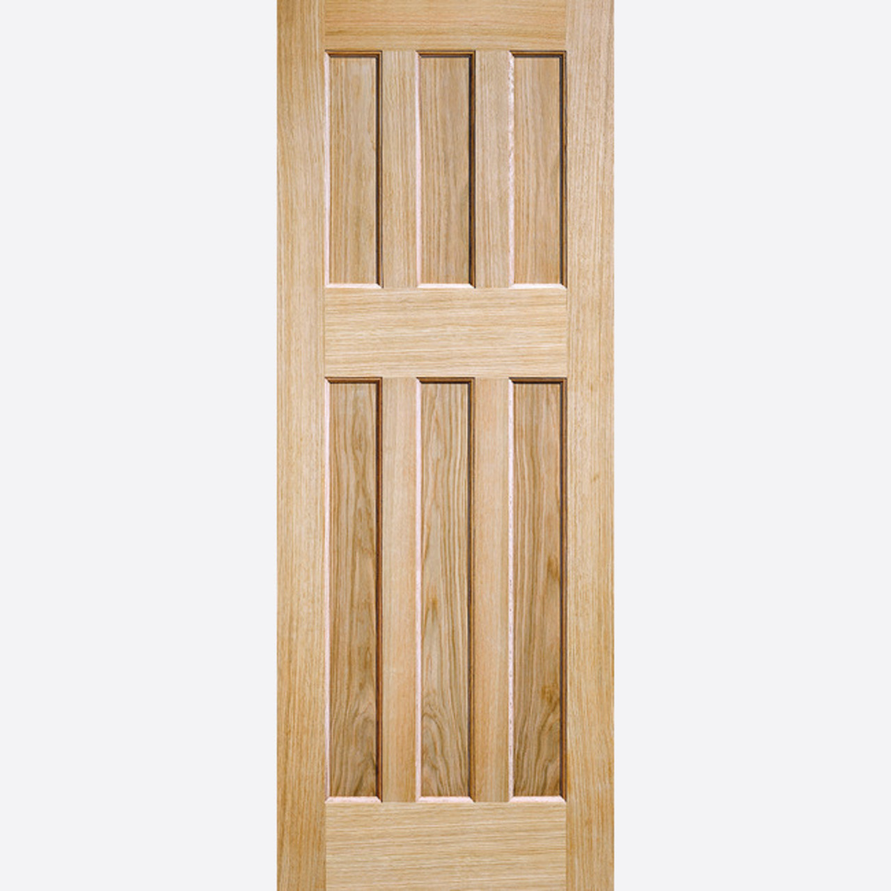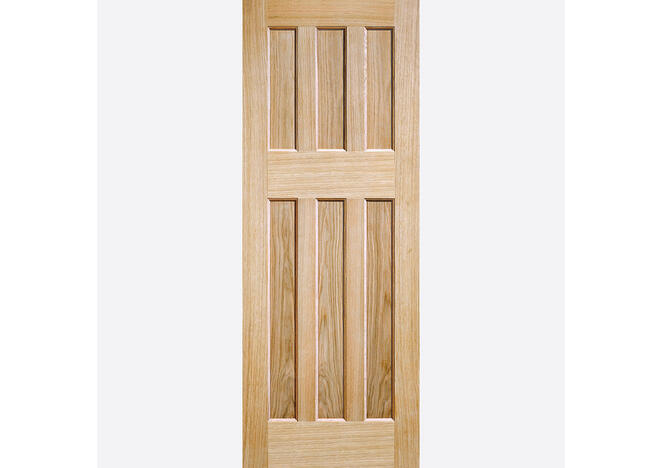 This 60's style door design features six rectangular shaped inset panels in a beautiful unfinished Oak wood.