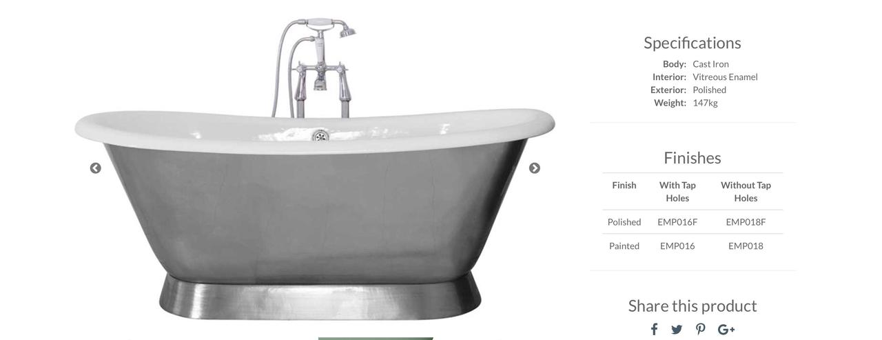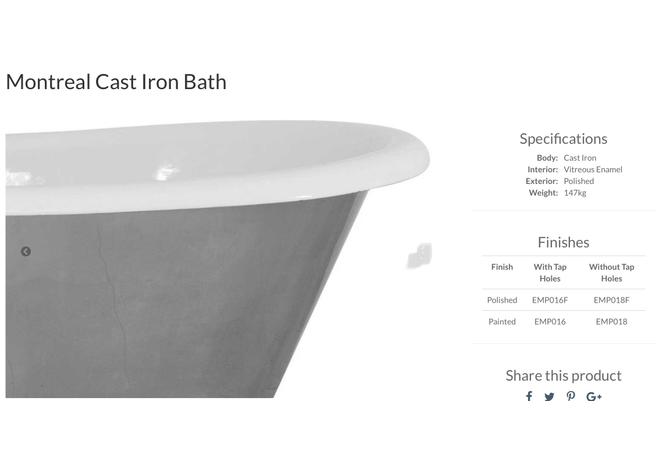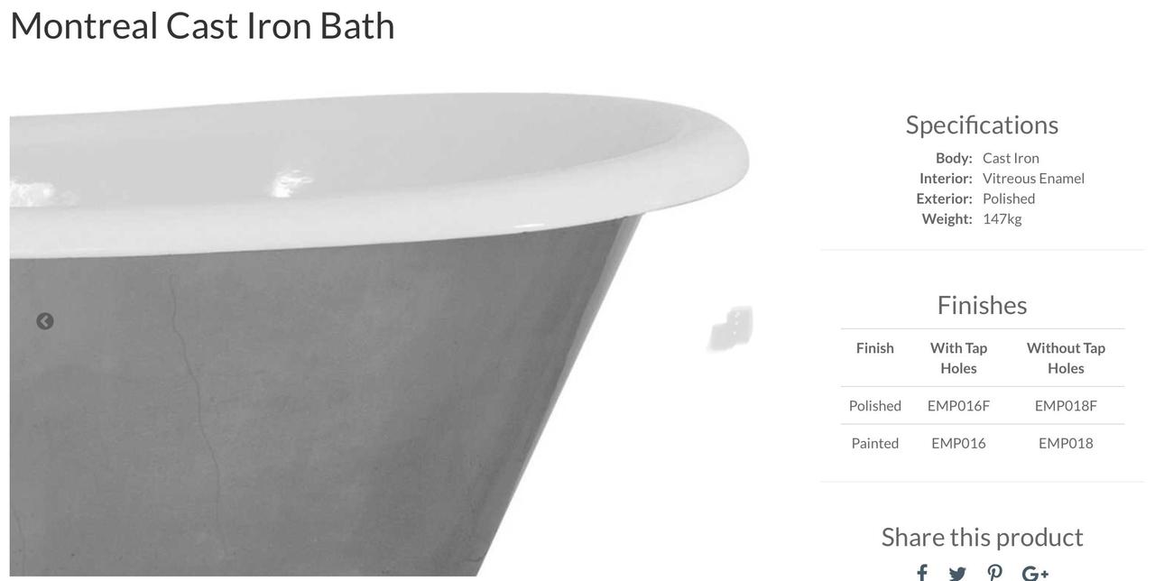 Also Available with Tap Holes EMP016F - The Montreal cast iron bath boasts impressive depth and is a classic style.