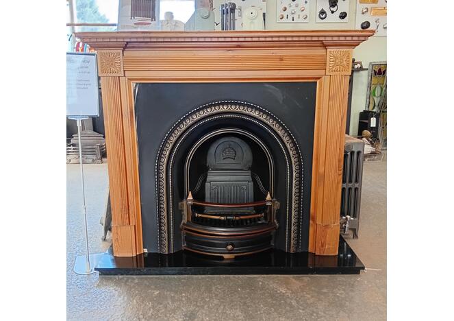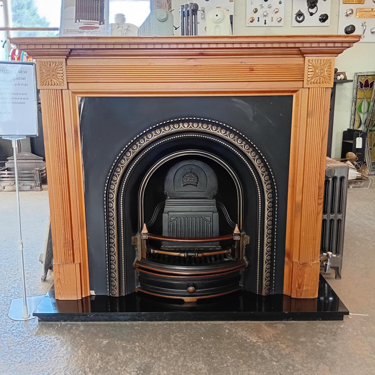 We are very happy to offer this Managers Special including a wonderful Arched insert with Wooden surround and boxed and lipped slate hearth.