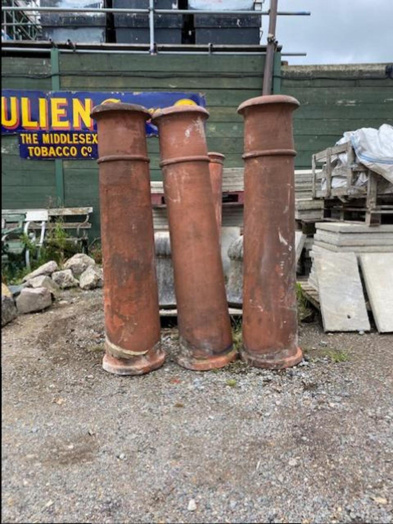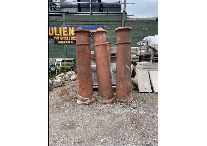 Set of three extra large period terracotta chimney pots. These chimney pots are also known as Canon top pot, the chimney pots are over 140 cm tall width of the top is 34 cm, £160 each or £450 for the set