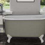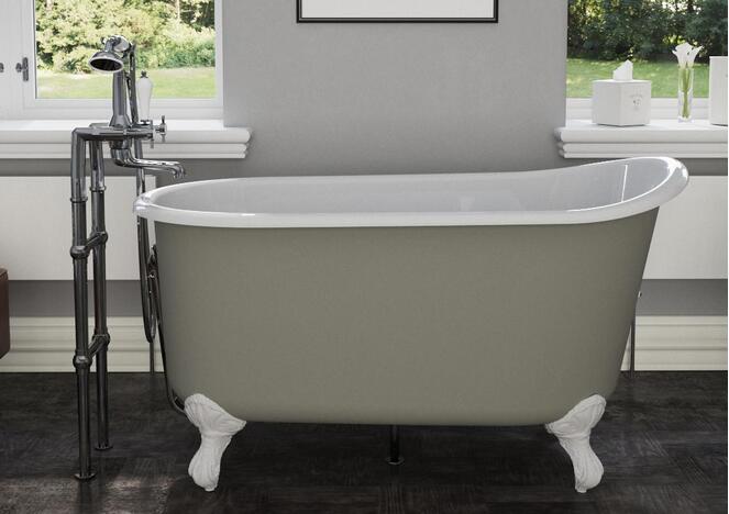 A petite single ended cast iron slipper bath with claw and ball feet and painted exterior. The interior is white vitreous enamel and this bath is available without tap holes. the exterior can be painted a colour of your choice.