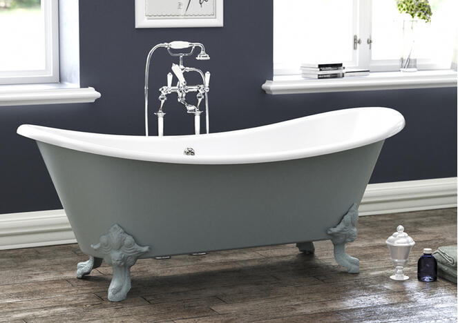 A double ended roll top bath with slightly raised ends and a tall foot detail which is based on a claw and ball style. Made from cast iron with a painted exterior and a white vitreous enamel interior. The bath can be painted in a colour of your choice and is available without tap holes.