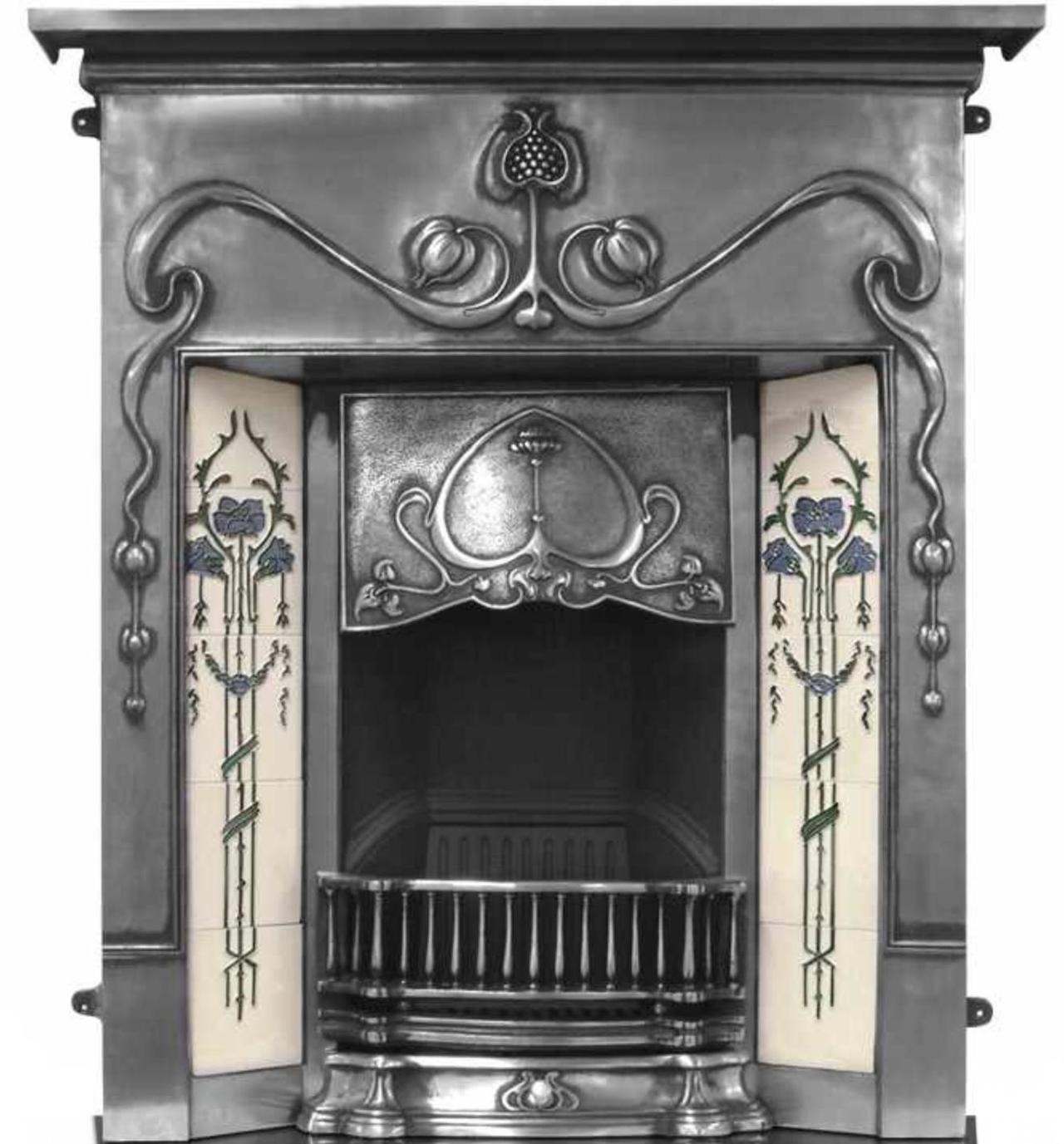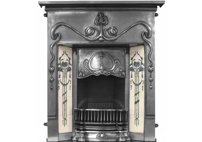 The Valentine is an Art Nouveau cast iron fireplace, styled with a symmetrical pomegranate design that extends from the centre of the frieze to fill the legs of the framework.