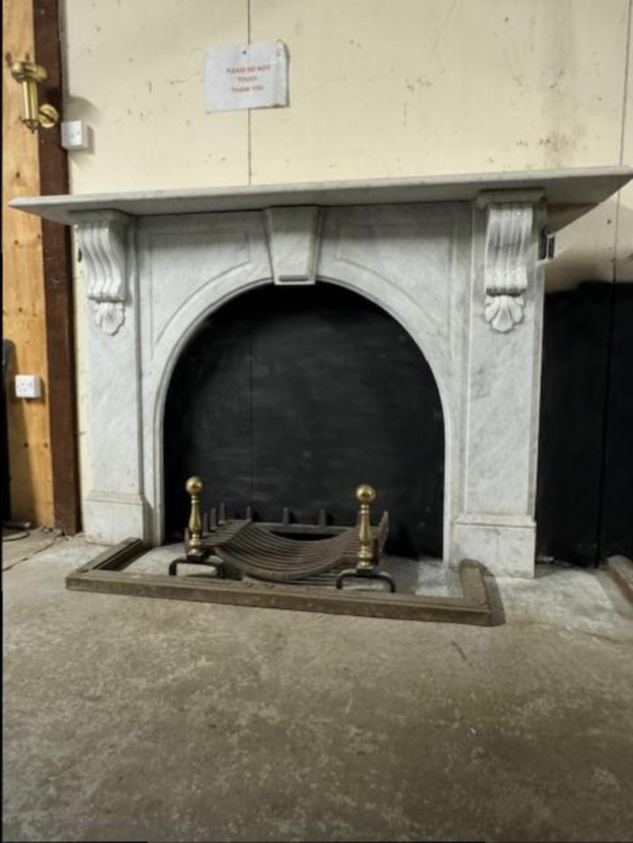 This stunning reclaimed marbel arch fire surround has inlayed detailing and carved corbels . It is complemented by the polished cast iron Cameo fire insert with wonderful castings .